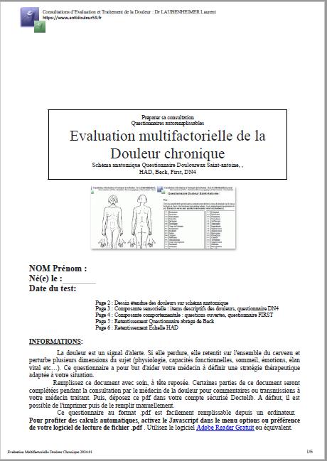 Ce questionnaire *auto-remplissable* aide à l'évaluation des différentes composantes de vos douleurs chroniques. Il est plus facile et rapide à remplir. Déposez ce questionnaire dans la section Documents de votre compte sécurisé Doctolib ou imprimez et ramenez ce questionnaire rempli lors de votre 1ère Consultation.
